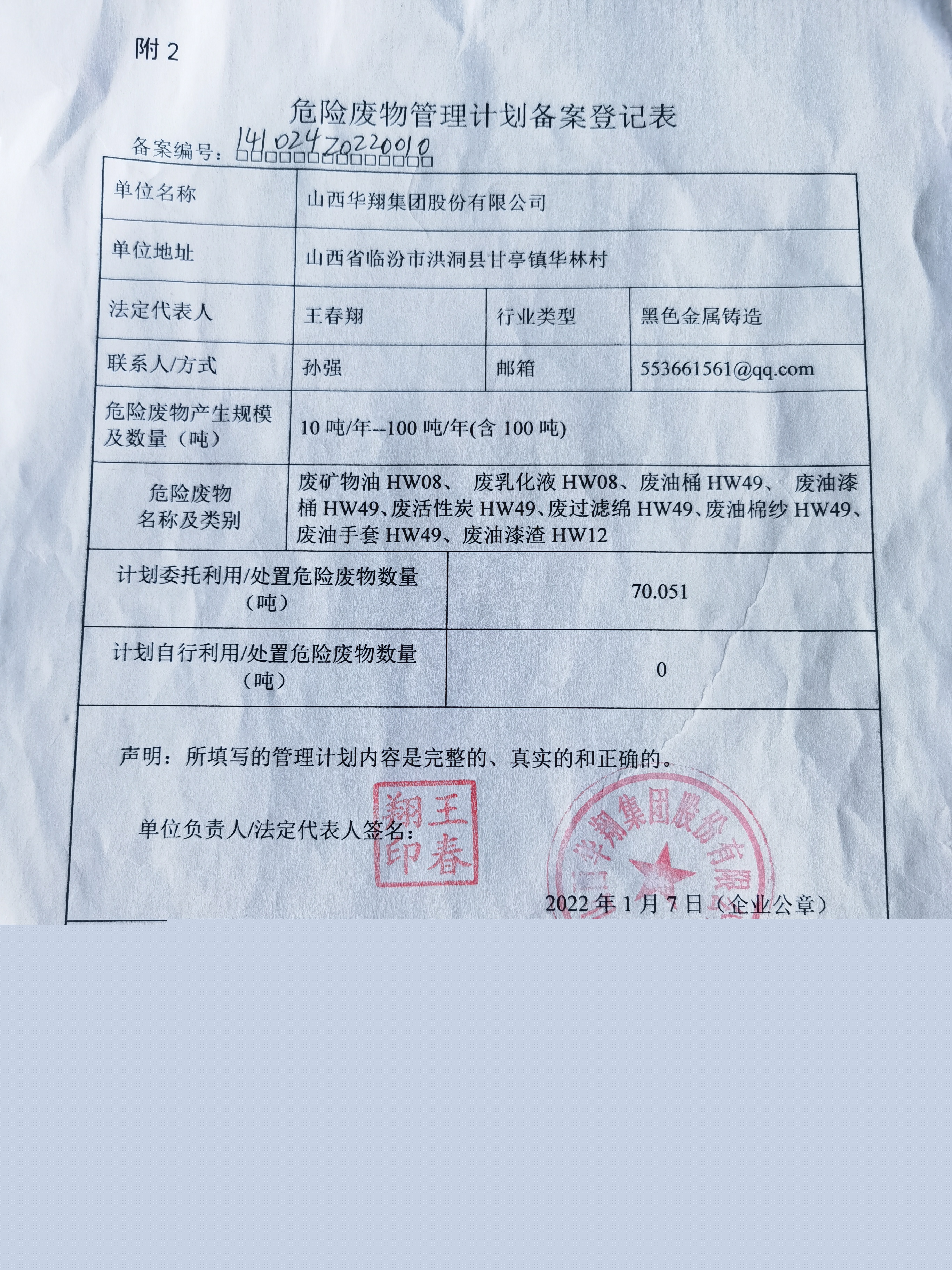 山西華翔集團(tuán)股份有限公司危險(xiǎn)廢物污染防治責(zé)任信息公示